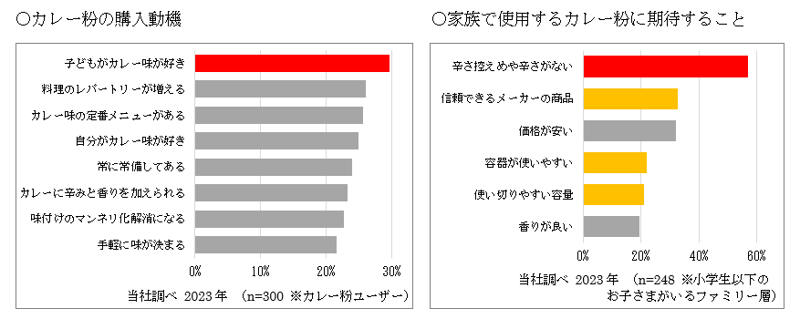カレー粉の購入動機として、「子どもがカレー味が好き」との理由を挙げる方が多く、お子さまに食事 を楽しんでもらう工夫として、カレー粉が活用されていることが分かります。一方、子どもを持つファミリー層や熟年層、シニア層においては、カレー粉の「辛み」が購入時のハードルや使用時の不満となっているケースが存在しています。