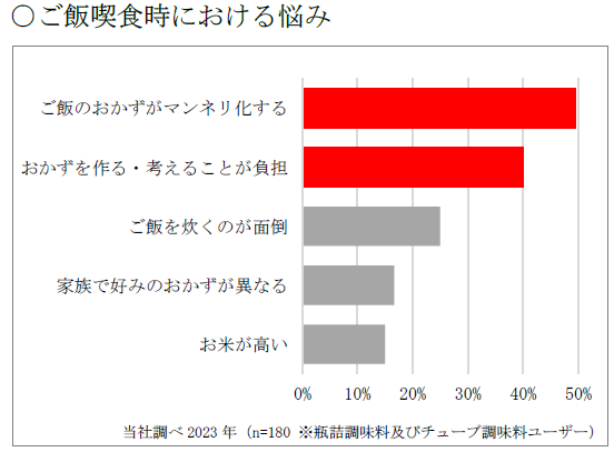 物価高騰に伴い、安価で価格が安定している「米」を中心としたメニューへの期待が拡大しています。一方で、ご飯のお供になるメニューに対し、味わいのマンネリ化や調理の負担、献立を考えることに対する不満が見られ、新しい味わいや調理の簡便性への関心が高まっています。