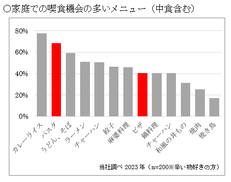 辛い味わいへの好意度は高く、近年増加傾向にあります。継続する激辛ブームや、外食・中食におけるメニュー選択肢の多様化はもちろん、不透明な社会環境、物価高が続く中で、嗜好性の高い「辛さ」に対する期待は今後も高まると推察されます。また、簡便食品や中食との親和性が高いパスタやピザは、今後喫食頻度が増えると予想されます。