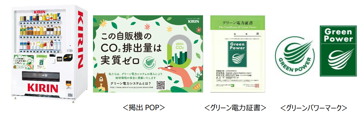 今回展開する「グリーン電力自動販売機」は、稼働に必要な年間消費電力量に相当する「グリーン電力証書」を取得することで、その自動販売機は「グリーン電力」を使用したとみなされ、GHGの排出量を相殺することが可能になります。「グリーン電力自動販売機」には、「グリーン電力証書」や、「CO2の排出量実質ゼロ」を掲げたPOPを掲出することで、地球環境の保全に貢献する自動販売機であることを訴求していきます。