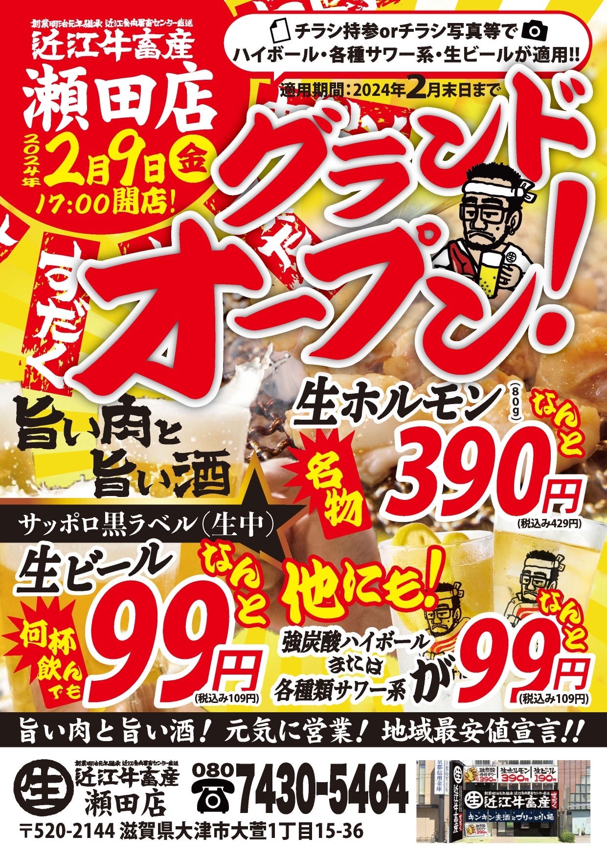 2/9(金)の近江牛ホルモン畜産すだく瀬田店のグランドオープンを記念して、「生ビール(中)と強炭酸ハイボール、各種サワー系が、、な、な、な、なんと!!!99円!?」キャンペーンを開催いたします。
