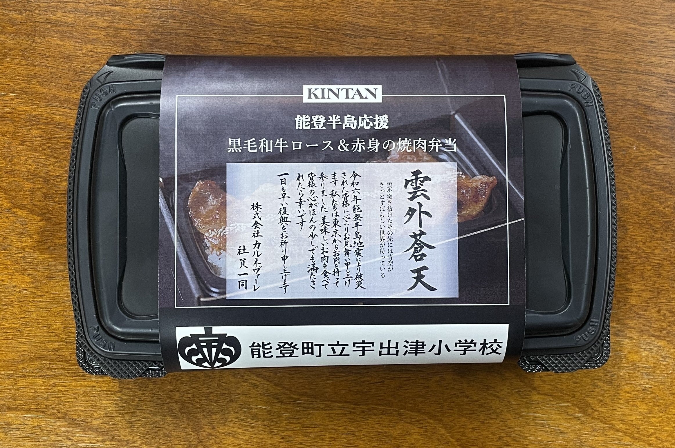 震災直後から七尾市の商業施設・パトリアを拠点に活動している一般社団法人熊本支援チームと連携し、能登町立宇出津小学校、能登町立能都中学校をはじめとする全7校に学校給食として黒毛和牛ロースと赤身の焼肉弁当730食を提供いたします。