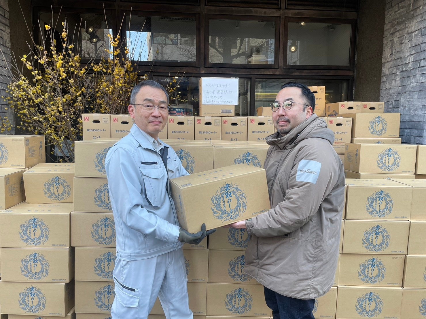 代表取締役社長の鳴坂竜一の母親の出身地が丹波山村である縁から、令和5年10月6日に鳴坂を「丹波山村ふるさと大使」に委嘱いただきました。今回、木下村長に被災地支援計画に賛同いただき、村の地下水を使ったミネラルウォーター「雲取のしずく」(500ml入りペットボトル)2,400本を協賛いただきました。雲取のしずくは、東京、山梨、埼玉の1都2県にまたがる日本百名山の雲取山(標高2,017メートル)に降った雨や雪が山の土壌でろ過され、湧き出したものを、丹波山村の小袖(こそで)地区の地下約120メートルから取水してボトリング。軟水で、まろやかな味わいが特徴です。