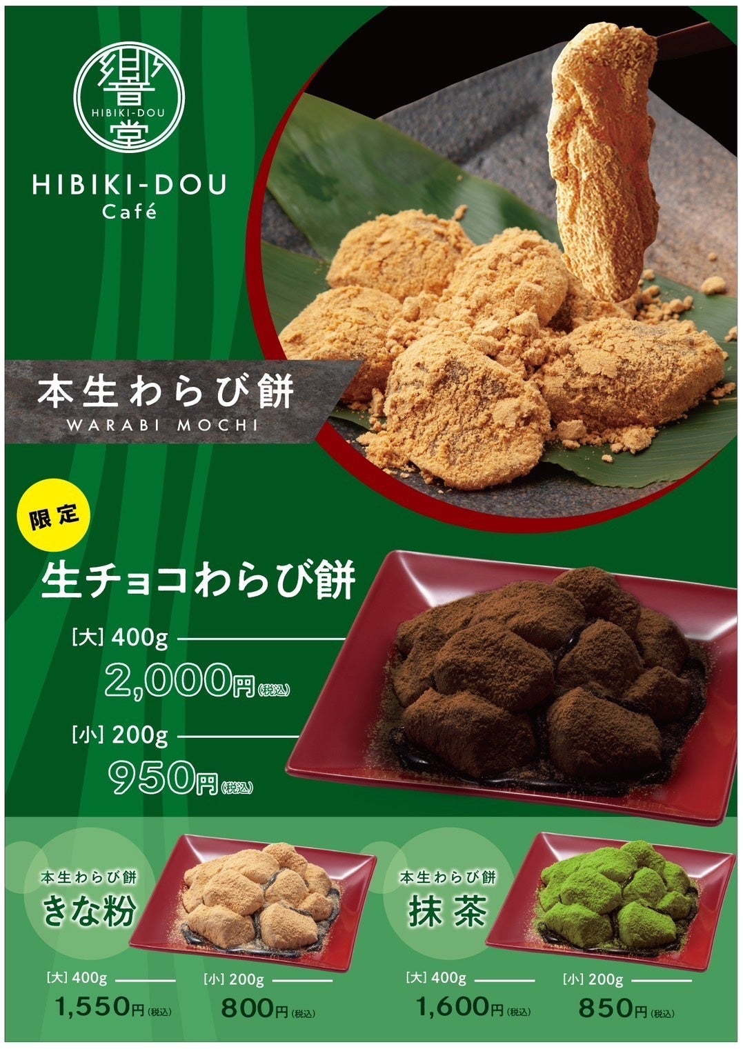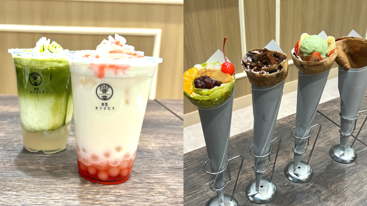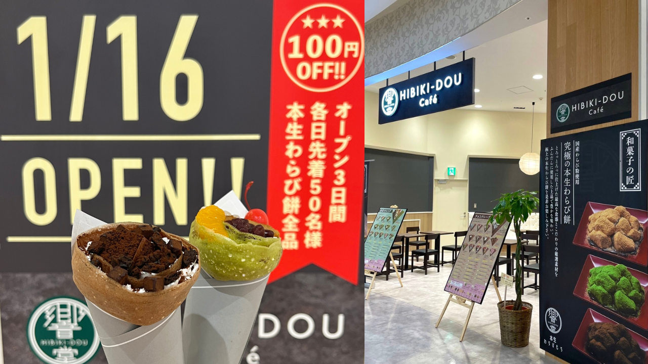 和スイーツ専門店『HIBIKI‐DOU cafe』では、和菓子職人の匠が作る「わらび餅」、和をモチーフにしたクレープや当店オリジナルのドリンクを販売いたします。