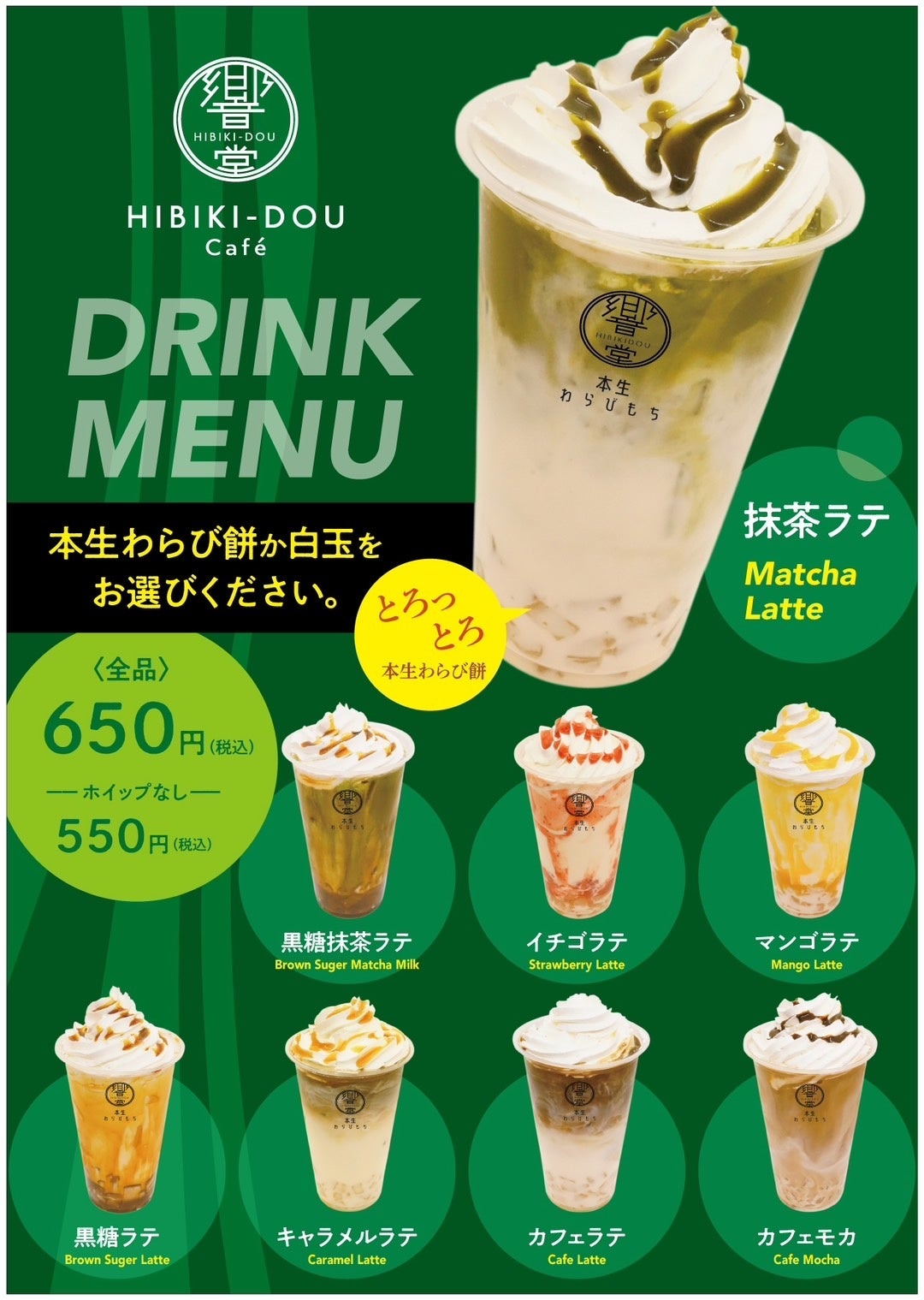 また、わらび餅が入った「抹茶ドリンク」などオリジナルドリンク各種も販売。トッピングはわらび餅以外にも、白玉をお選びいただけます。