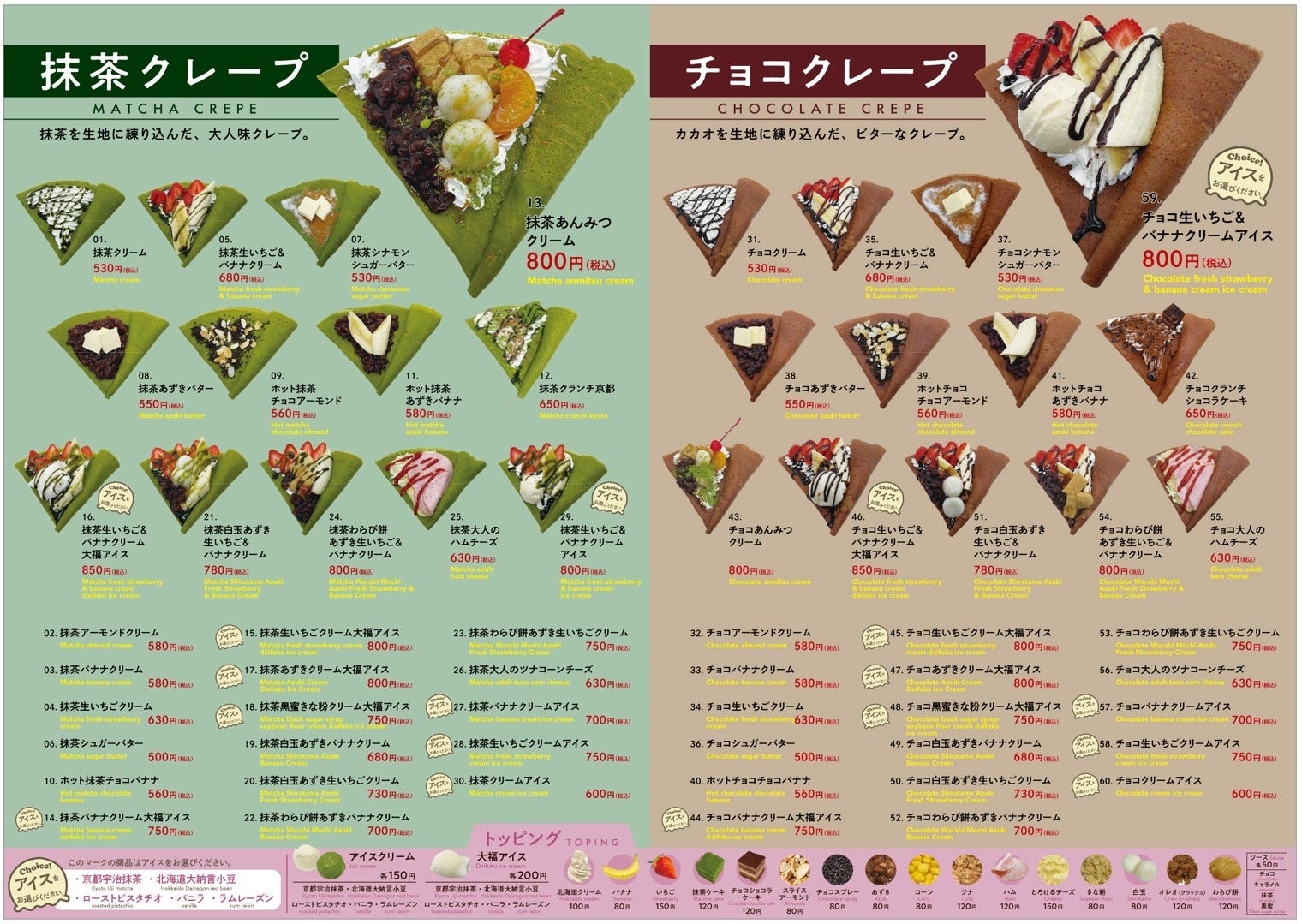 本生わらび餅・ドリンク以外にも、抹茶を生地に練り込んだ、大人味クレープ「抹茶クレープ」各種、