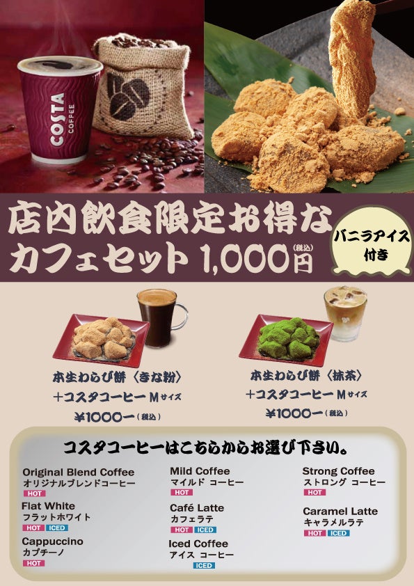 「本生わらび餅 きな粉」「本生わらび餅 抹茶」と、あの人気カフェブランドの “COSTA COFFEE” のコーヒーのセットをご用意しております。