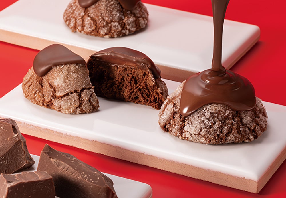 濃厚なコクたっぷりのショコラバタークッキーにココアパウダーを練り込んだなめらかなホイップショコラをとじこめ、さらに上からスイートチョコレート入りのコーティングチョコをとろりと流しかけました。クッキーはバター含有率33%を誇るフレーバーバター味『バターステイツクッキー ショコラバター』を使用し、ショコラづくしの一品に仕上げています。今だけ出会えるショコラフォンデュの美味しさをお楽しみください。