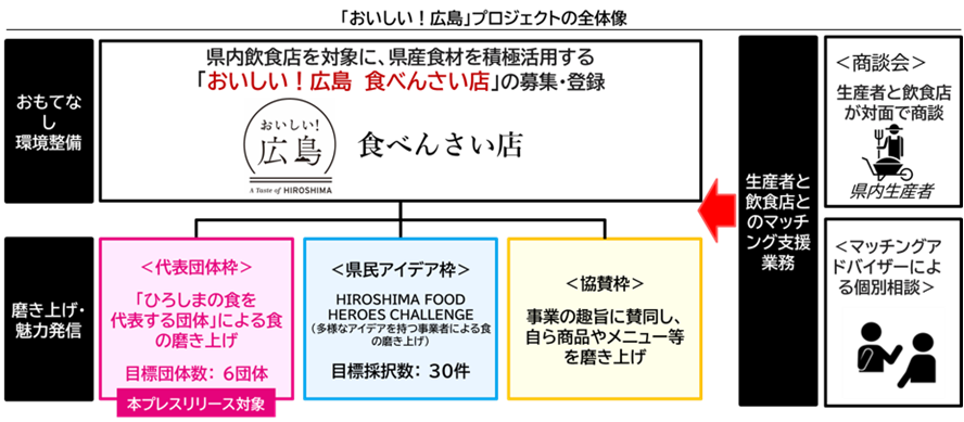 広島県では、県産農林水産物の販路・消費拡大を目的に、昨年5月に開催されたG7広島サミットを契機に、県の多彩な食資産を多様な主体と磨き上げるとともに、その魅力を発信をする「おいしい!広島」プロジェクト(以下、「本プロジェクト」)を推進しています。