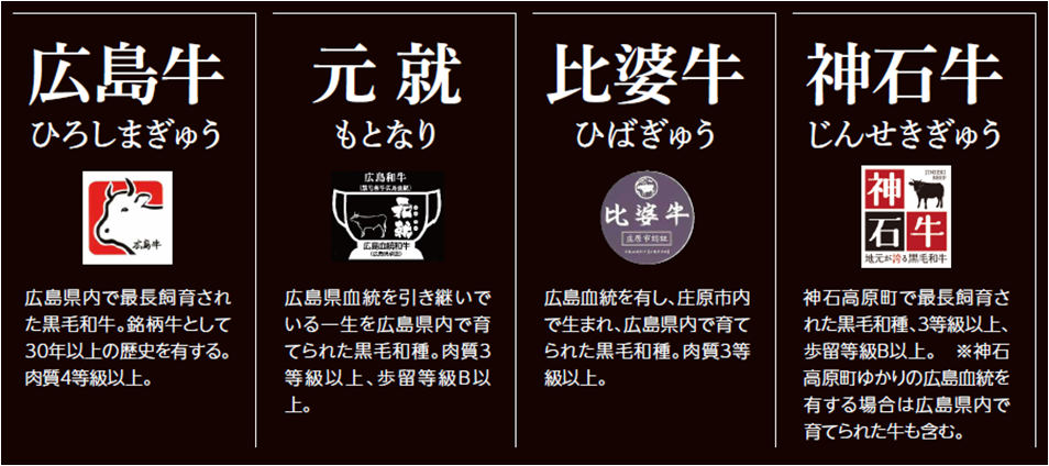 広島和牛とは、広島県内で最長飼育された黒毛和種の牛肉で、広島県産和牛のことを指しています。特定の銘柄や商標ではなく、「広島牛」、「広島和牛元就」、「比婆牛」、「神石牛」などの県内和牛銘柄を総称して「広島和牛」といいます。