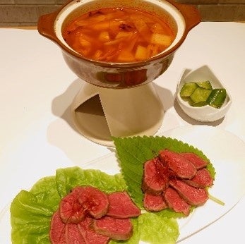 ■メニュー名: 旨辛ユッケジャンスープで鹿肉しゃぶしゃぶ
