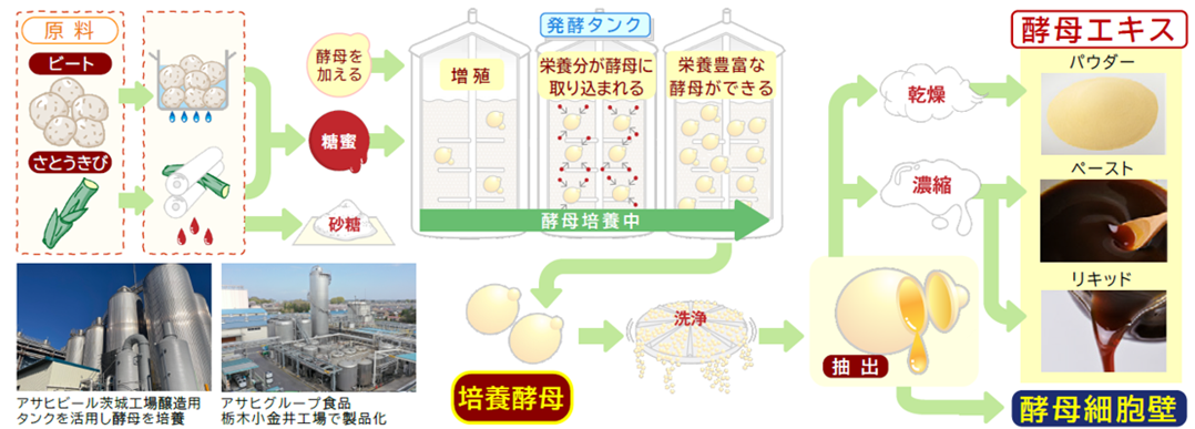近年、酵母エキス需要の高まりに対して、ビール製造量の減少とともにビール酵母の供給が減少してきたことから、アサヒグループ食品では、海外メーカーに酵母の培養・生産化を委託し、輸入していましたが、今回、アサヒビール・茨城工場のビール醸造用タンクを活用して、酵母を培養する技術が確立したためアサヒグループ内での国内一貫製造が実現しました。