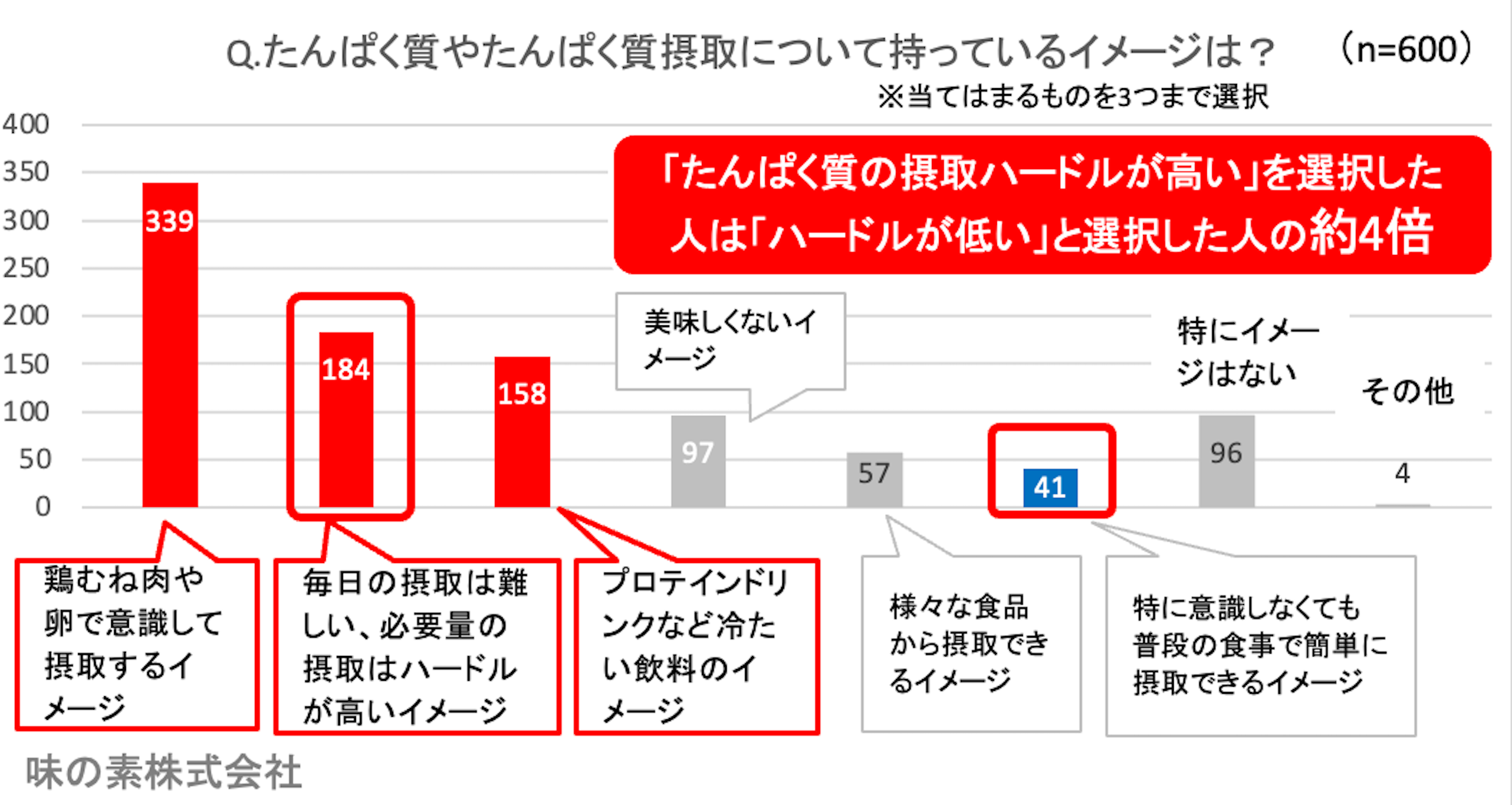 ■上位は「忙しくて食事の準備に手間がかけられない」「忙しくてたんぱく質摂取を気にかけられない」「普段の食事では簡単に摂取できない」「必要量の摂取はハードルが高い」の4つ。