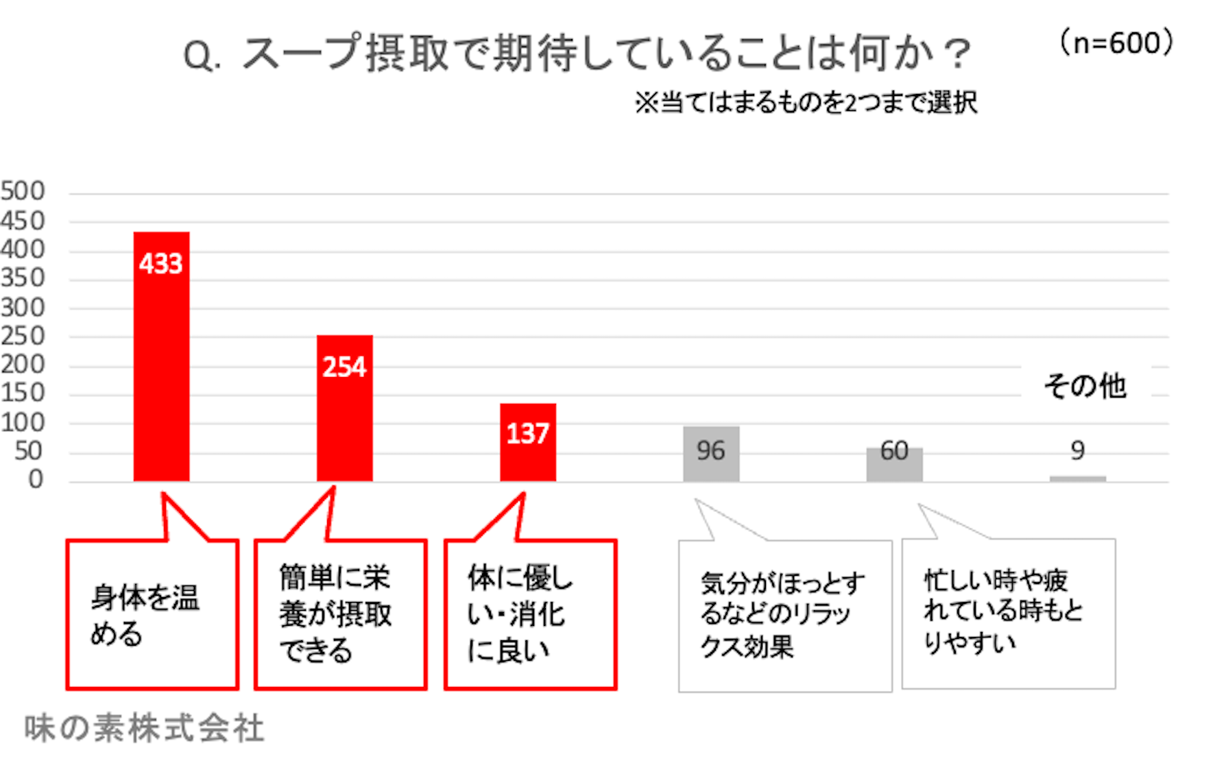 ■「身体を温める」ことがトップ。ついで「簡単に栄養が摂取できる」こと、続いて「体に優しい・消化に良い」という結果に。