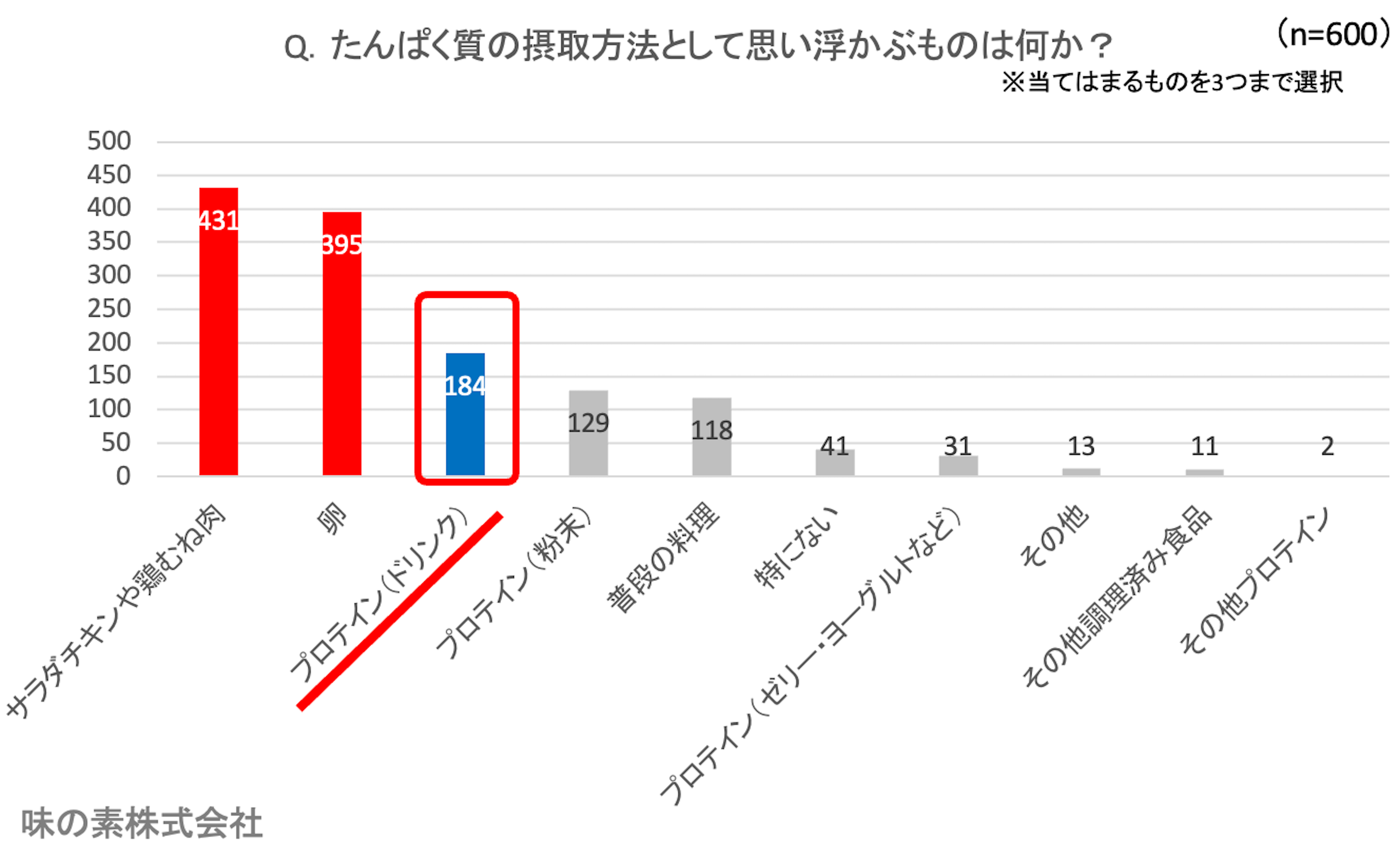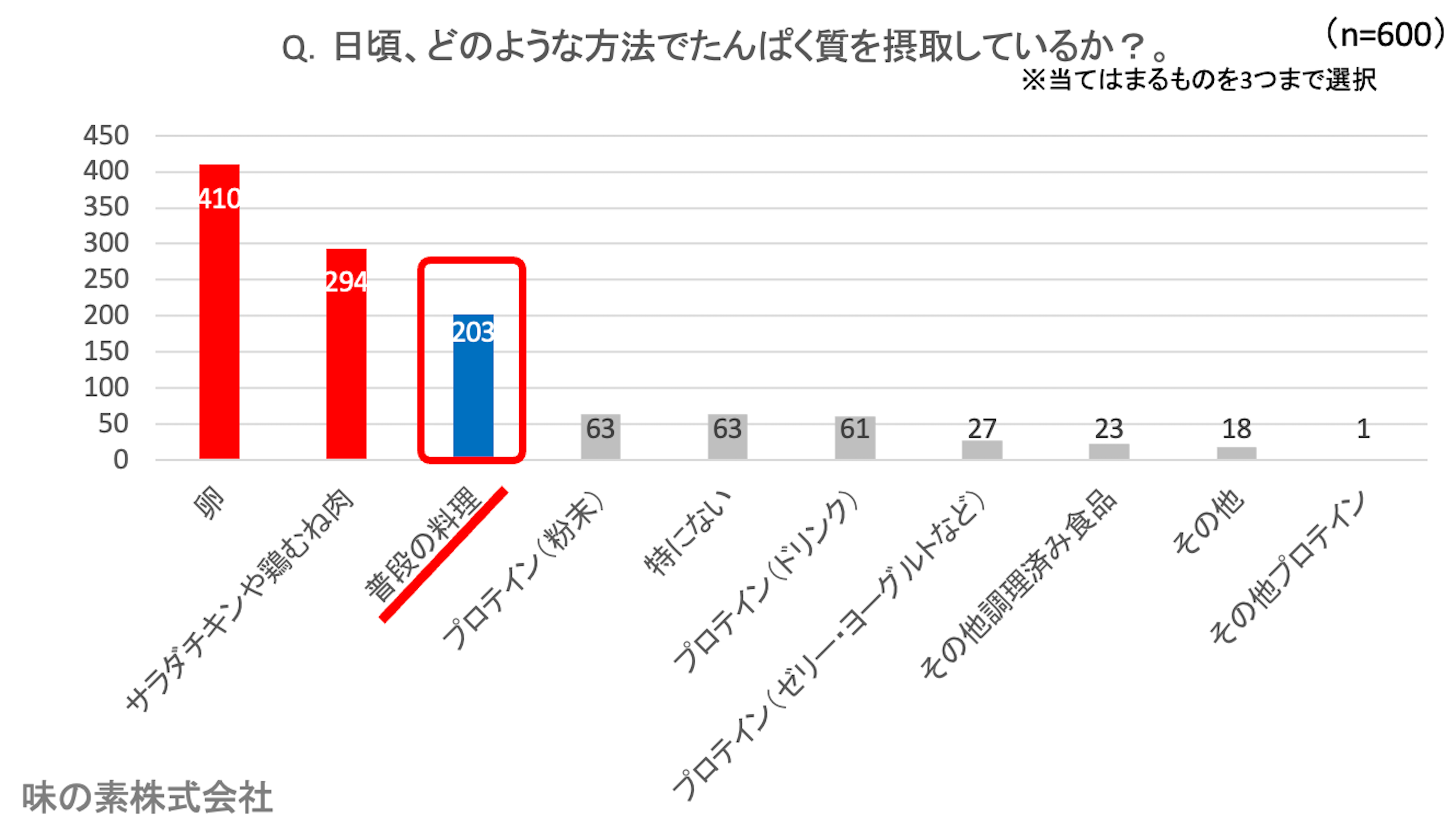 ■実際にどのようにしてたんぱく質を摂取しているか聞いたところ、上位から順に「卵」「サラダチキンや鶏むね肉」などの固形の食品となり、3番目に多かったのは、たんぱく質の摂取方法として想起する人が多かった「プロテイン」ではなく、「普段の料理(食事)」という結果に。