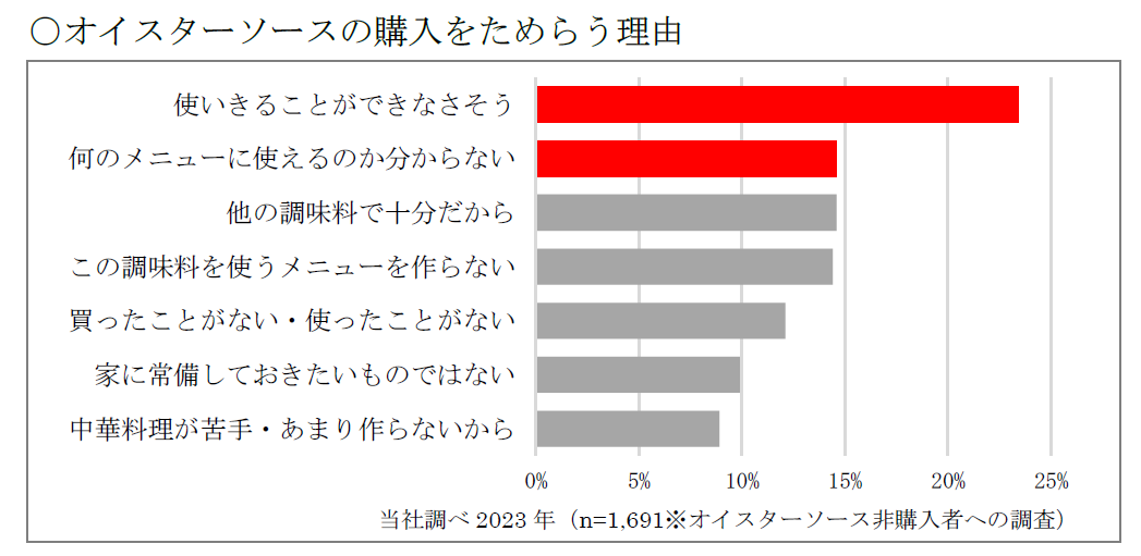オイスターソースに対しては、「使い切ることができない」「どのメニューに使用すればよいか分からない」などの理由で購入をためらう方がいることがうかがえます。