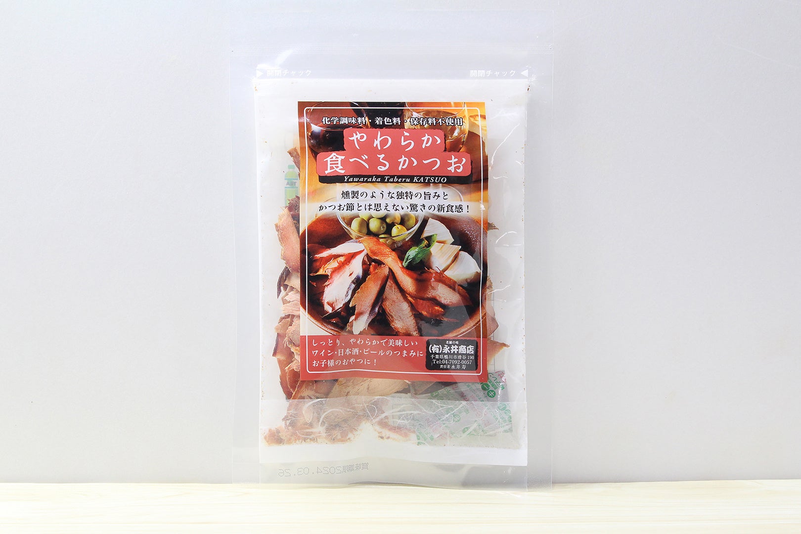 硬い鰹節を独自製法で醤油ダレに漬け込み、薄くスライスしたことで食べやすく、さらに美味しくなりました。鰹の旨味に醤油の香ばしさが加わり生まれる味わいと、しっとりとした新しい食感は、お酒のお供にもぴったり!洋食と組み合わせても美味しいと評判です。