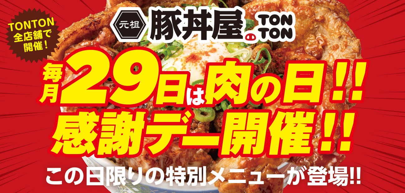 ワンズトライン株式会社(本社:大阪市北区芝田2丁目3番16号、代表取締役:山内仁)が運営する、北海道・帯広伝統の豚丼が人気の「元祖豚丼屋TONTON」では、毎月29日に肉の日感謝DAYを実施します!