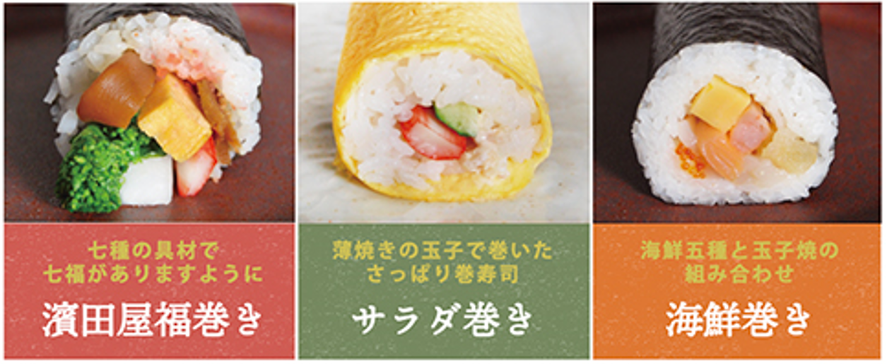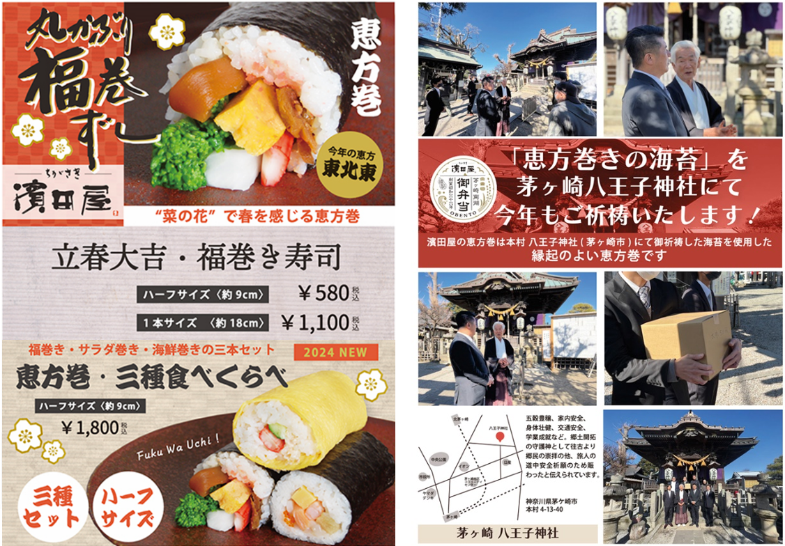まん福ホールディングスグループのちがさき濱田屋(株式会社浜田屋 本社:神奈川県茅ヶ崎市、代表取締役社長:下田彰彦、以下 「濱田屋」)では、濱田屋の恵方巻 「立春大吉・福巻き寿司(1本サイズ・ハーフサイズ)」 「恵方巻・三種食べくらべセット」 「お子様福巻き」を2月2日(金)、3日(土)の期間限定で発売いたします。数に限りがございます。ご予約も承っておりますので、是非お早目にご予約ください。