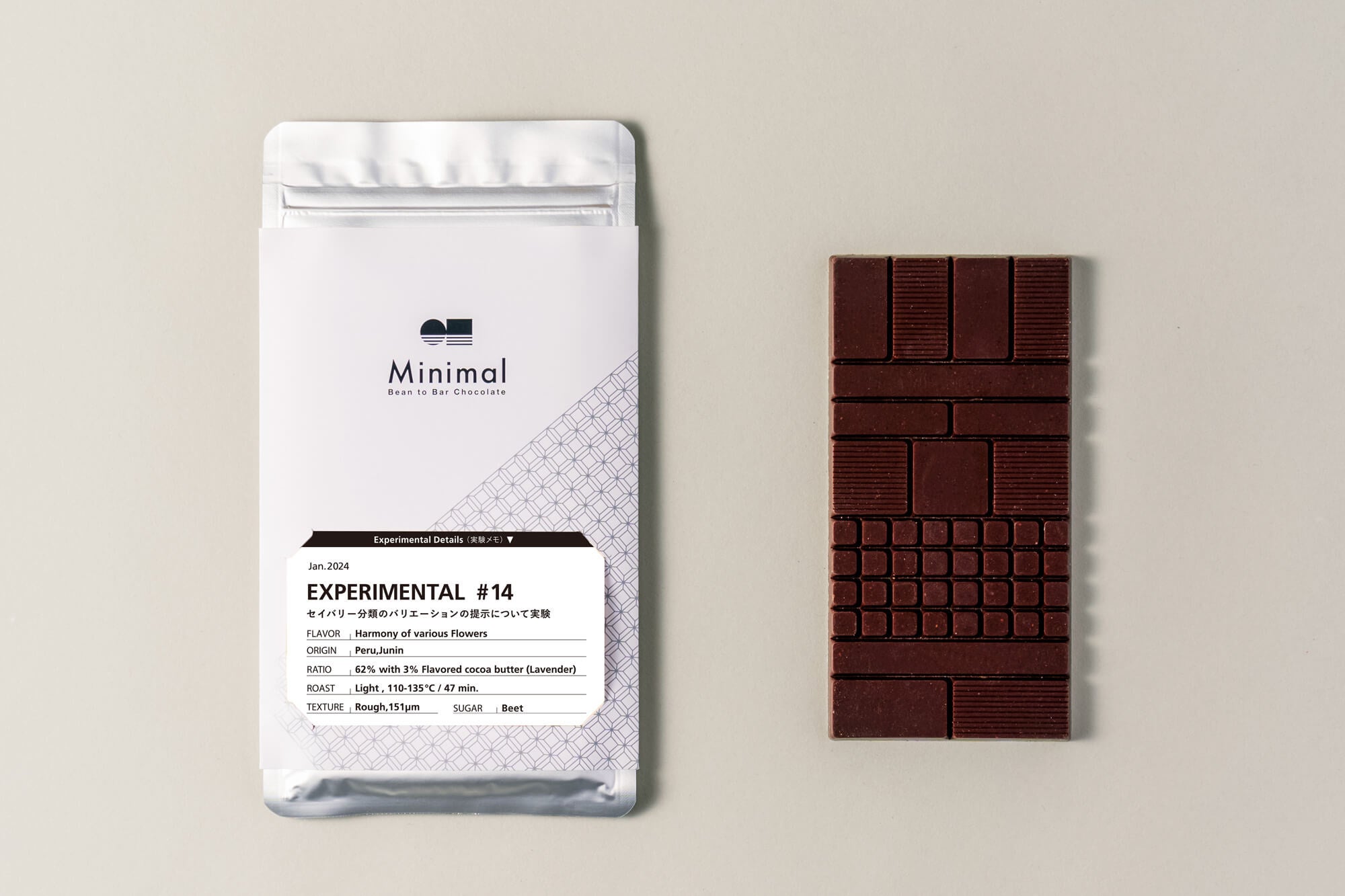 今回の「EXPERIMENTAL #14」では、植物や花のようなカカオ由来の豊かな香りを感じるラインである「SAVORY」に着目しています。ベリーのような果実味をもつペルー産のカカオ豆にラベンダーで風味付けしたココアバターを合わせ、とがった果実味をおさえつつ、多彩な花の香りを楽しめる配合を探りました。口の中で移ろいゆく味わいをぜひお楽しみください。