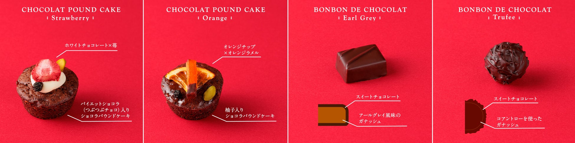 今年のバレンタインは、「ジャパン・フード・セレクション」(2023年11月受賞)でグランプリを受賞した、2002年の創業から続くロングセラーのプティフルーツパウンドケーキのショコラバージョンと紅茶とトリュフのボンボンショコラをアソートした限定スイーツを販売いたします。