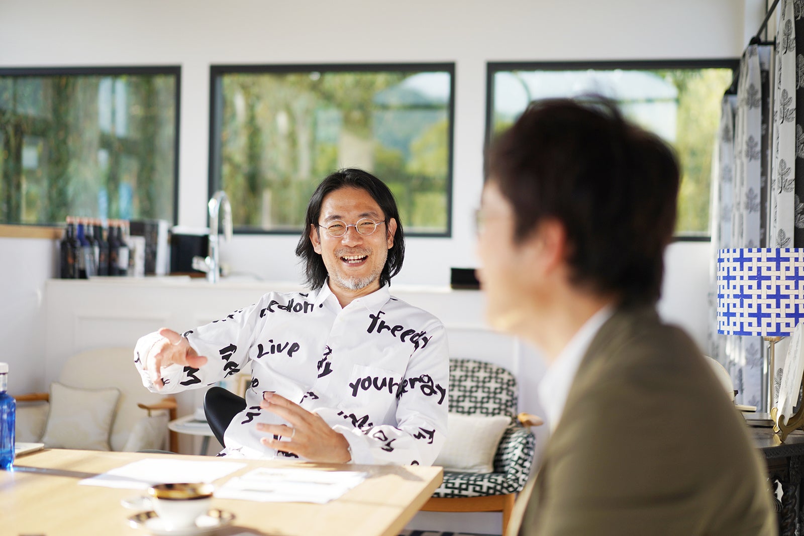 今回のオリジナルデザイン風呂敷は、水田、そして空の青を表現しています。この青色はトト氏が絵の具を調合し、山田繊維株式会社(むす美)さんに依頼し、オリジナルで染めた青色で、光により色の見え方が変わります。包装紙ではなく、1000年以上前から使われているという記録がある風呂敷としたことにも、1000年先に今の風景を引き継ぎたい想いを込めました。コラボレーションを象徴する両者のロゴは、より上質なものとする為、刺繍に。糸は銀糸を使っており、お米、つまり銀シャリの光沢感を表現しています。