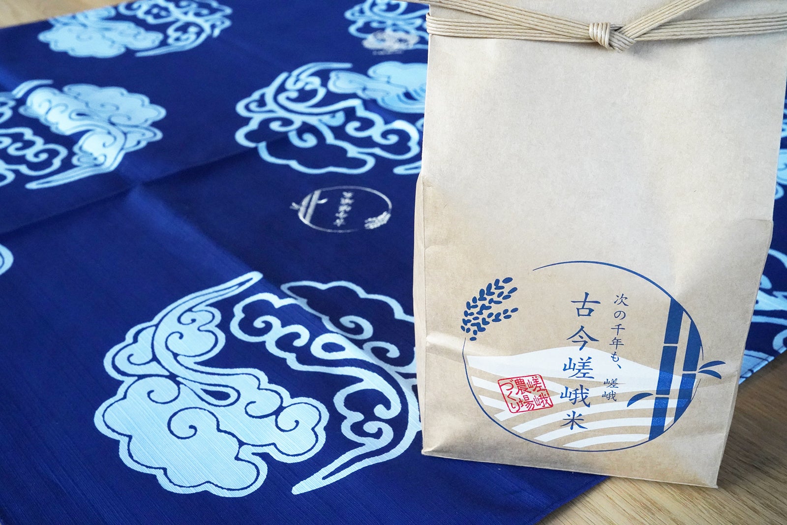 今回、当会発足10周年を記念して、2023年秋に収穫した「古今嵯峨米」と、嵯峨野を本拠地とする唐長 トトアキヒコ氏デザインの風呂敷(山田繊維株式会社(むす美)製)とのコラボレーション商品が生まれました。