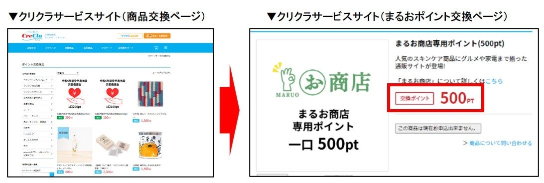 当社が運営する「クリクラサービスサイト」はクリクラ会員向けのポイントサイトです。クリクラ商品購入金額の2%ポイントが貯まり、多くの会員の皆様にご利用いただいております。貯まったポイントは、クリクラを注ぐだけで利用できる商品(スープ・お味噌汁・お茶・お米など)をはじめ、楽天ポイントやAmazonギフトコード、JALのマイル交換など幅広い商品ラインナップでご利用いただけます。今回のサービス開始により、クリクラ会員はECサイト「まるお商店」内で利用ができるポイントに交換することが可能になります。