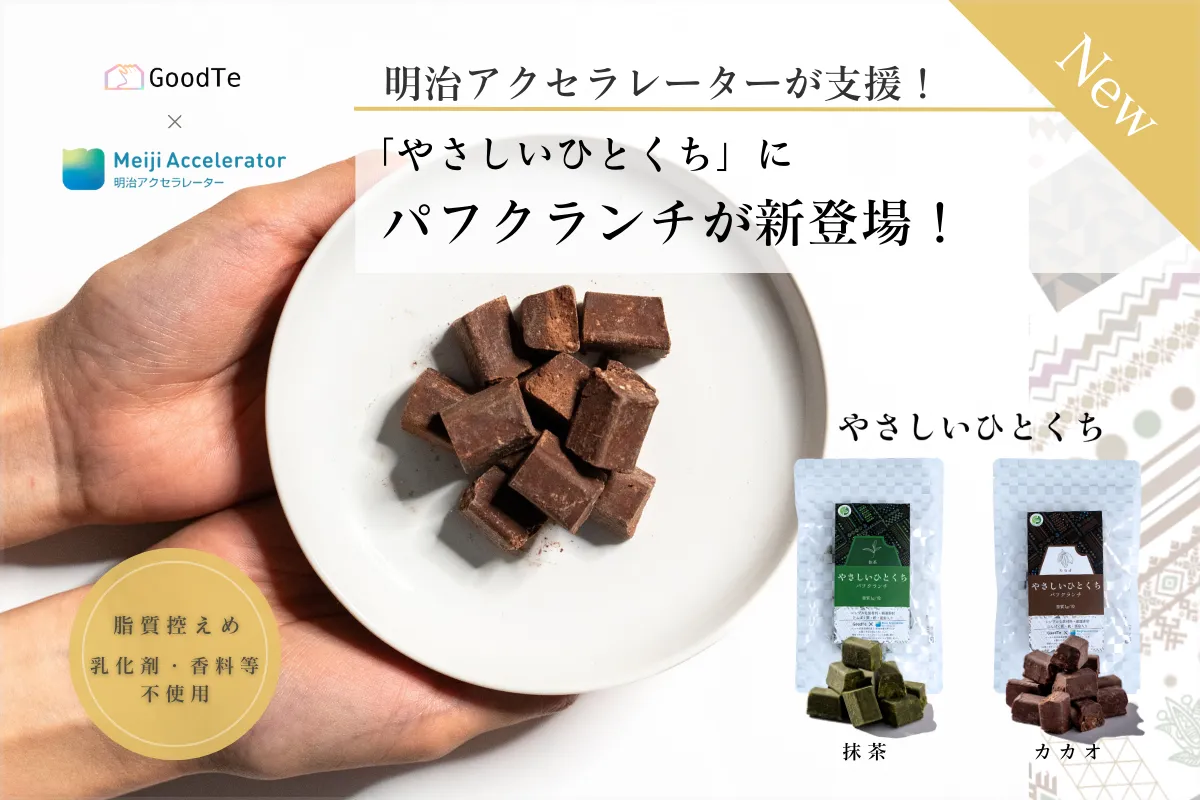 「やさしいひとくち パフクランチ」は、厳選素材とこだわりの技術で素材そのものの風味を楽しめるリッチな味わい、心地良い歯ごたえのひとくちパフクランチです。一般的に乳化剤を使わず脂質控えめのチョコレートを作ることは難しいと言われていますが、明治アクセラレーターの支援を受け、こだわりの製法と原材料で実現しました。カカオ味にはベネズエラ産のロースト感の強いカカオ、抹茶味には宇治抹茶を使用しました。脂質1g/粒、乳化剤・香料等の添加物不使用、低FODMAP(フォドマップ)でお腹にやさしい設計です。また不足しがちな栄養素と言われるたんぱく質、鉄、亜鉛も含まれています。