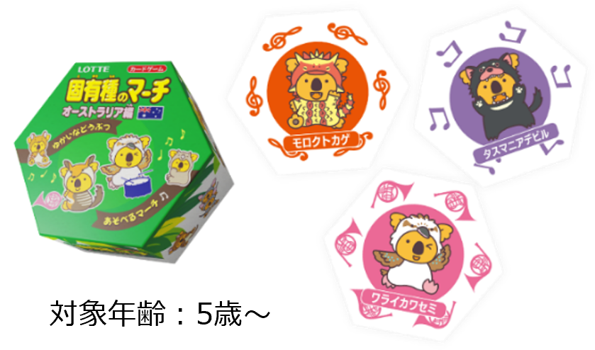 プロジェクトの第一弾は、「固有種のマーチ オーストラリア編」。1月29日(月)10時より期間限定で、このプロジェクトのために制作されたオリジナルデザインパッケージの商品をロッテオンラインショップ限定で受注販売いたします。また、本商品には遊びながらオーストラリアの固有種が学べるカードゲームが付いています。