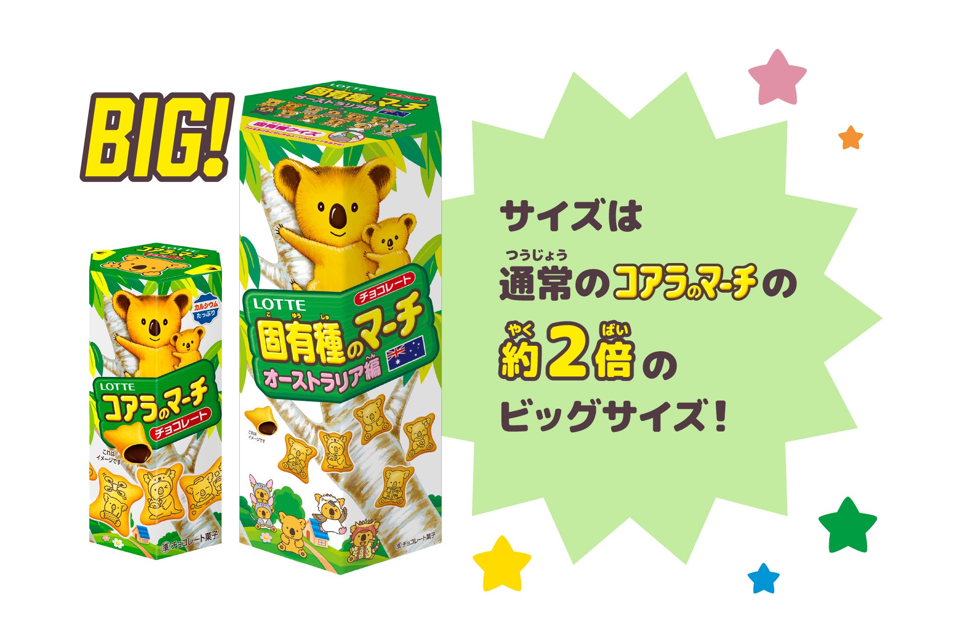 パッケージサイズは通常のコアラのマーチの約2倍のビッグサイズ