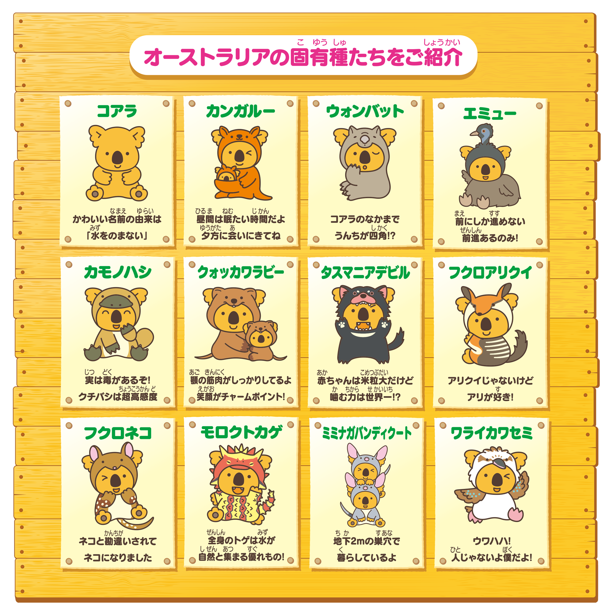 *コアラ、カンガルー、ウォンバット、エミュー、カモノハシ、クォッカワラビー、タスマニアデビル、フクロアリクイ、モロクトカゲ、フクロネコ、ミミナガバンディクート、ワライカワセミ