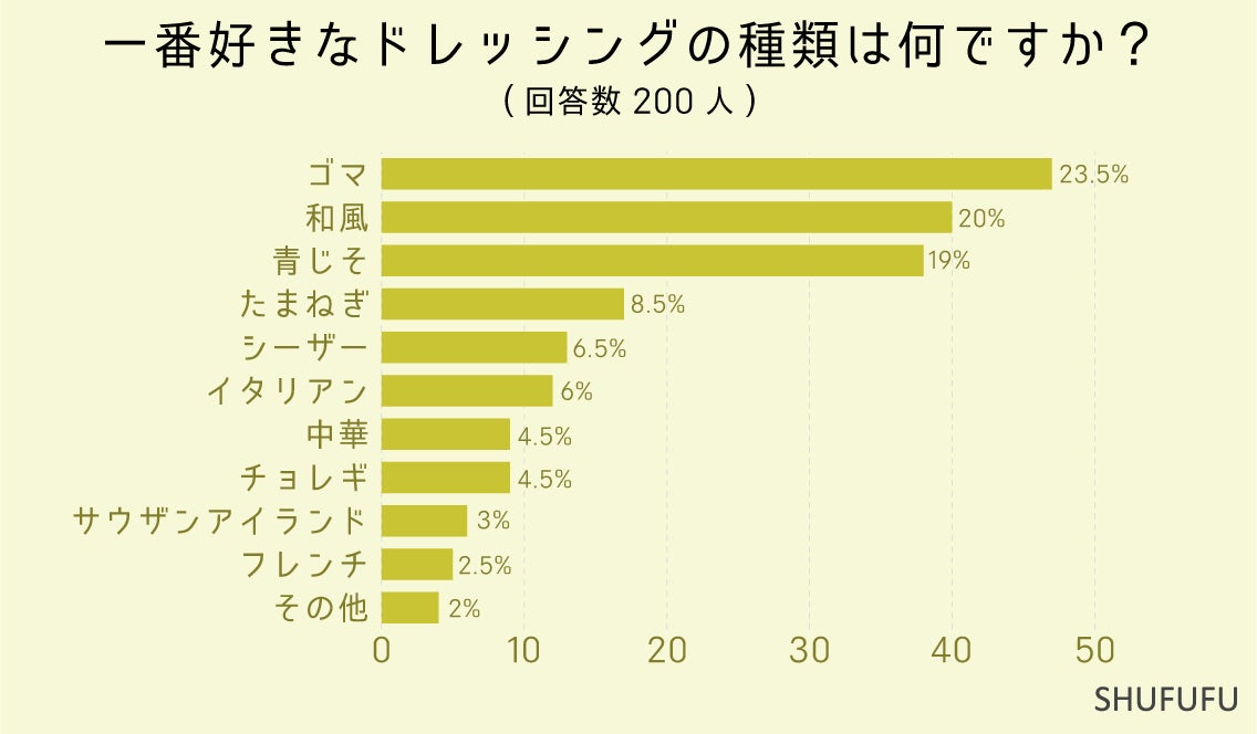 一番好きなドレッシングの種類は何ですか?の問いに対して最も多かったのが「ゴマ(23.5%)」でした。 次いで「和風(20%)」「青じそ(19%)」という結果でした。 4位のたまねぎは「8.5%」なので、1位~3位で拮抗しているようです。