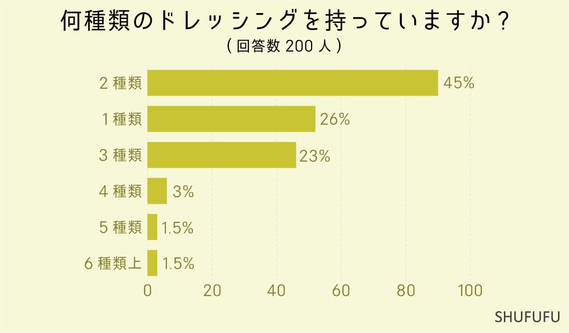 何種類のドレッシングを持っていますか?の問いに対して最も多かったのが「2種類(45%)」でした。 次いで「1種類(26%)」「3種類(23%)」という結果でした。 6種類以上ドレッシングを持っている人は「1.5%」いました。