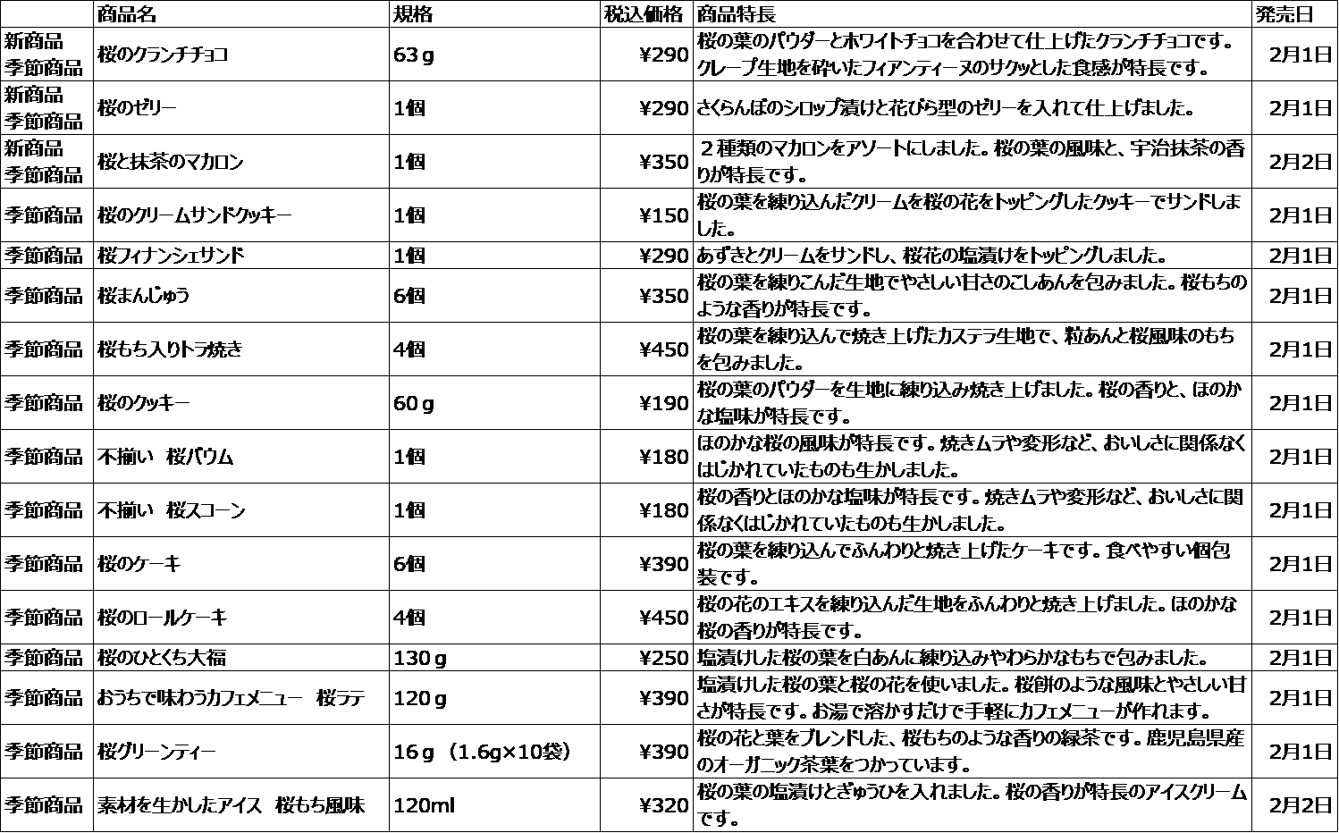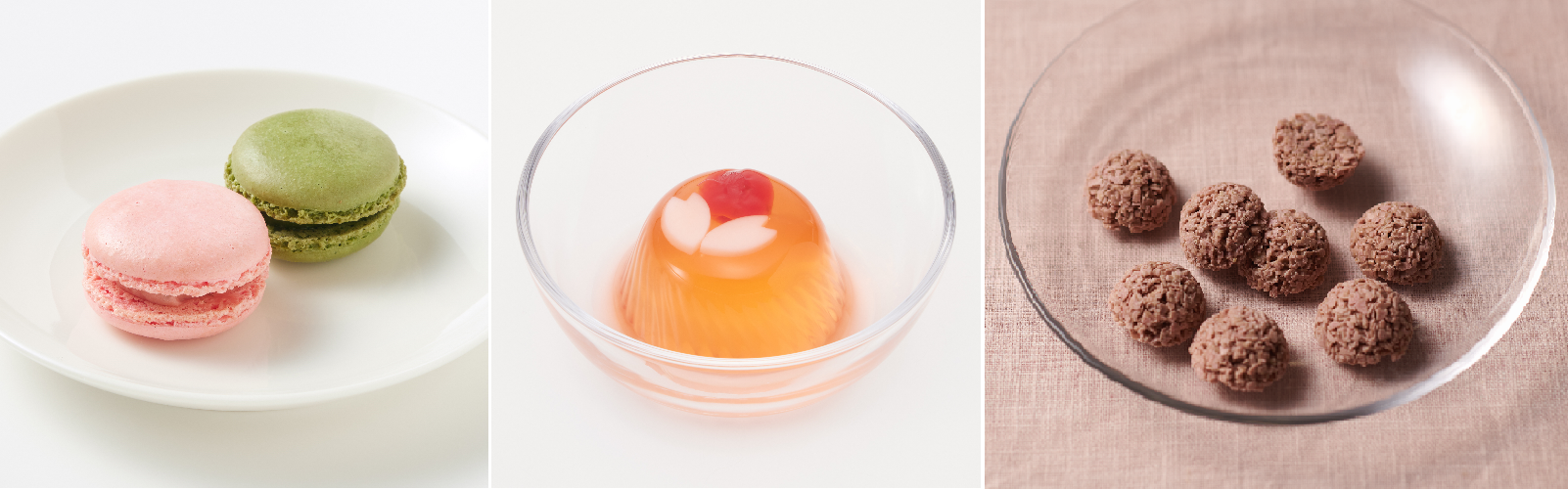 桜と抹茶の2種の味を楽しめるマカロンや見た目も楽しめるゼリー、食感が楽しいクランチチョコ新発売