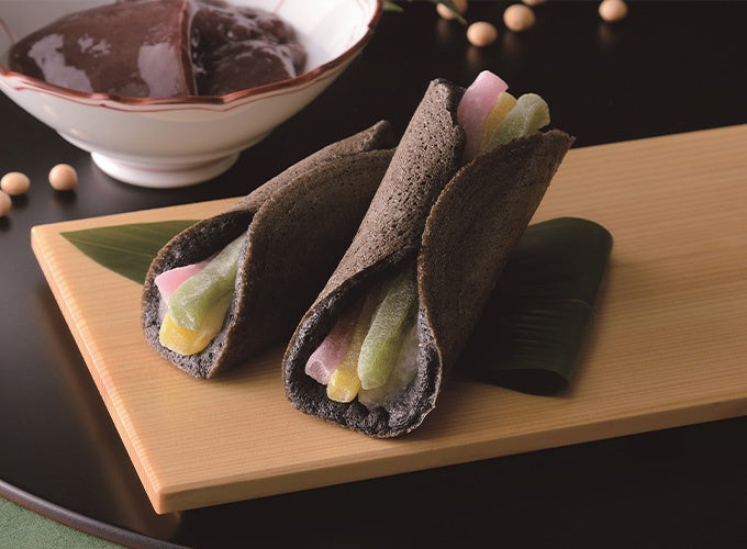 黒胡麻風味の生地で巻いた白あんと三色の求肥。巻寿司のように恵方に向かって食べるのもおすすめです!