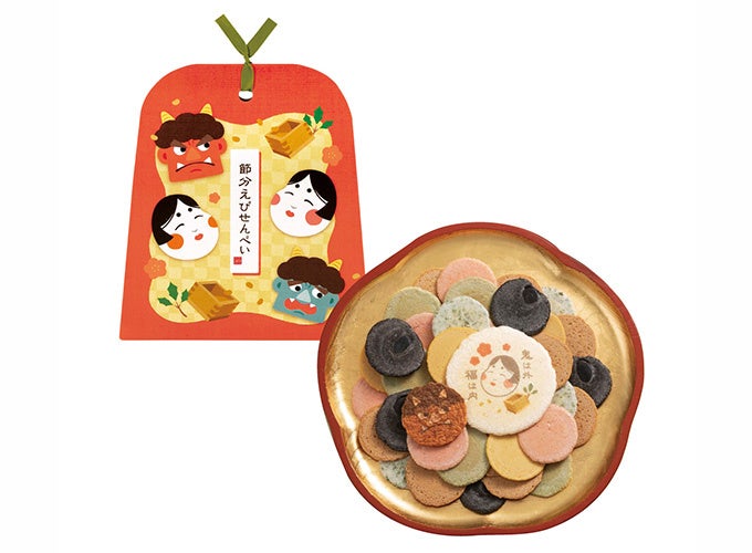 「五色の鬼」と「豆」にちなんだえびせんべい。美味しく食べて「いざっ 鬼退治!」8つの味のえびせんべいが入っています。えびせんべいをそれぞれの煩悩(鬼)に見立て、きなこ味のえびせんべいと一緒に食べることで1年の無病息災の願いを込めました。