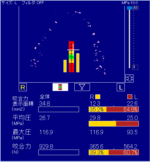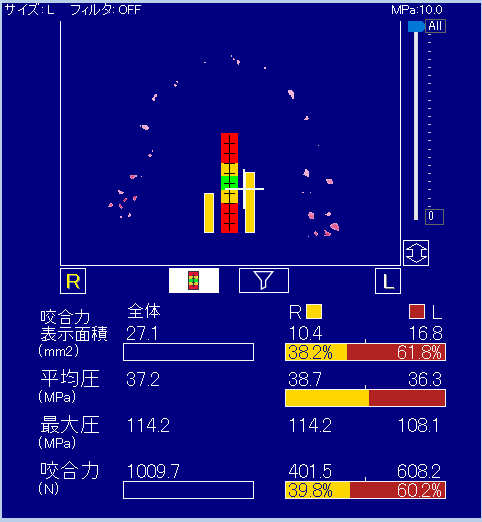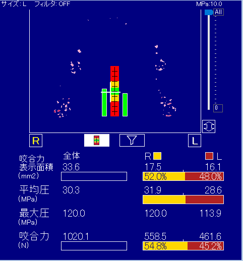 ▼噛むチカラ測定結果 ①:咬合力【単位:N(ニュートン)】、②:咬合力左右差