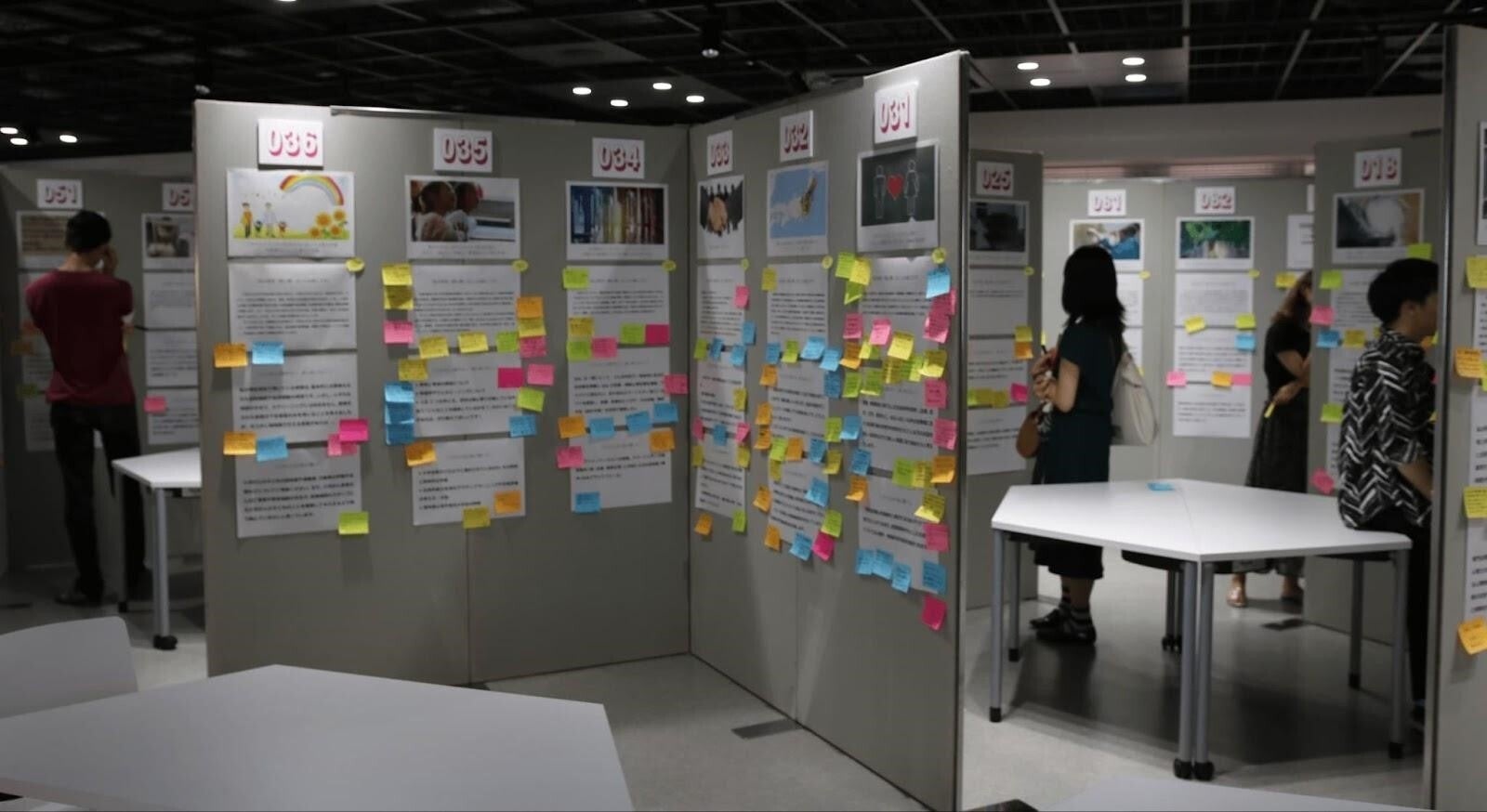 かつて実施された類似企画の参考写真(京都大学学際融合教育研究推進センター宮野公樹准教授、個人提供)。研究ポスターの上部に番号が振られており、発表者の所属や氏名はない。質問やコメントは無記名で付箋紙に書き込み、貼り付ける。発表項目もあえて3つに限定する。