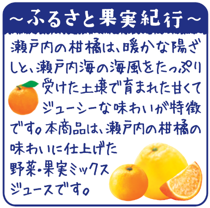 「野菜生活100 瀬戸内柑橘ミックス」は、暖かな陽ざしと、瀬戸内海の海風をたっぷり受けた土壌で育まれた甘くてジューシーな瀬戸内産柑橘(うんしゅうみかん、ぽんかん、はっさく、清見、ネーブルオレンジ、河内晩柑)の味わいに仕上げた野菜・果実100%ミックスジュースです。1日分の※1ビタミンC。が摂れます。朝食のおともやリフレッシュしたいときにおすすめです。パッケージには、瀬戸内海にかかる「来島海峡大橋」をデザインしています。