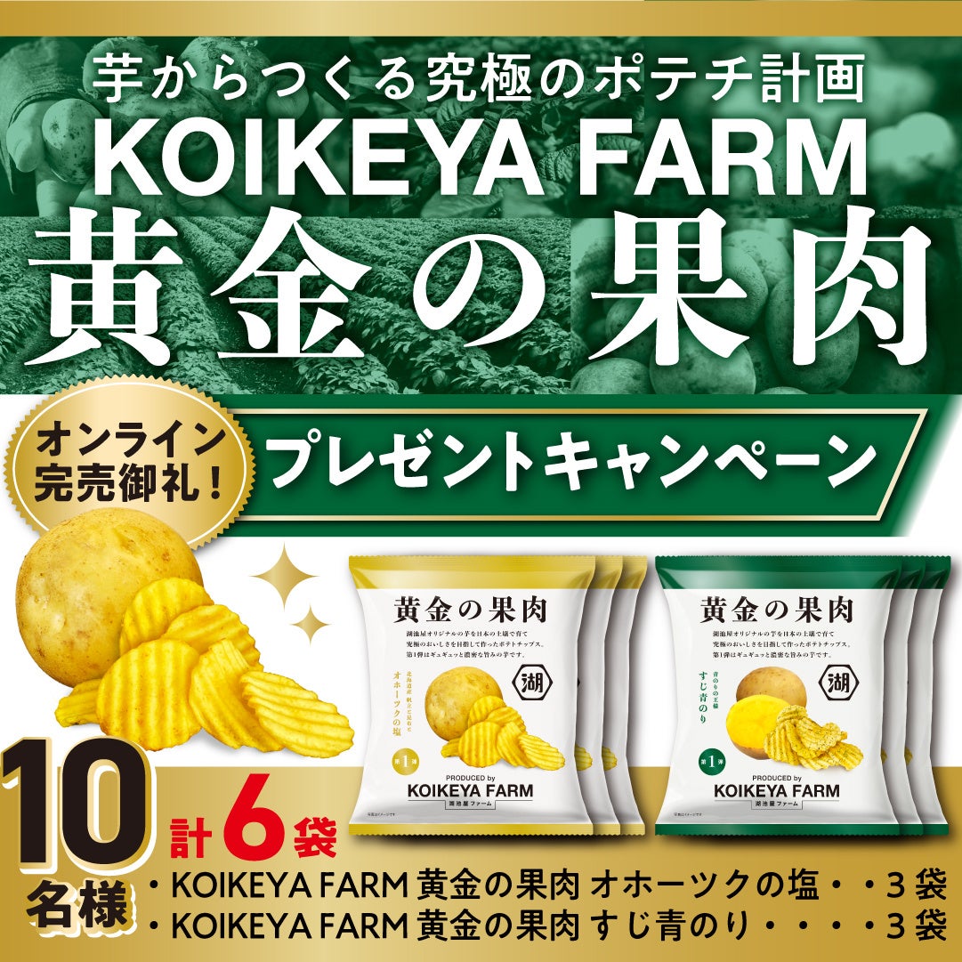 「KOIKEYA FARM 黄金の果肉」の湖池屋オンラインショップでの即完売の御礼の気持ちを込めて、商品が2品セットで当たるSNSキャンペーンを実施します。「KOIKEYA FARM 黄金の果肉 北海道産 帆立と昆布とオホーツクの塩」「同 青のりの王様 すじ青のり」を各3袋セットにして10名様に当たるキャンペーンに、ぜひご参加ください。