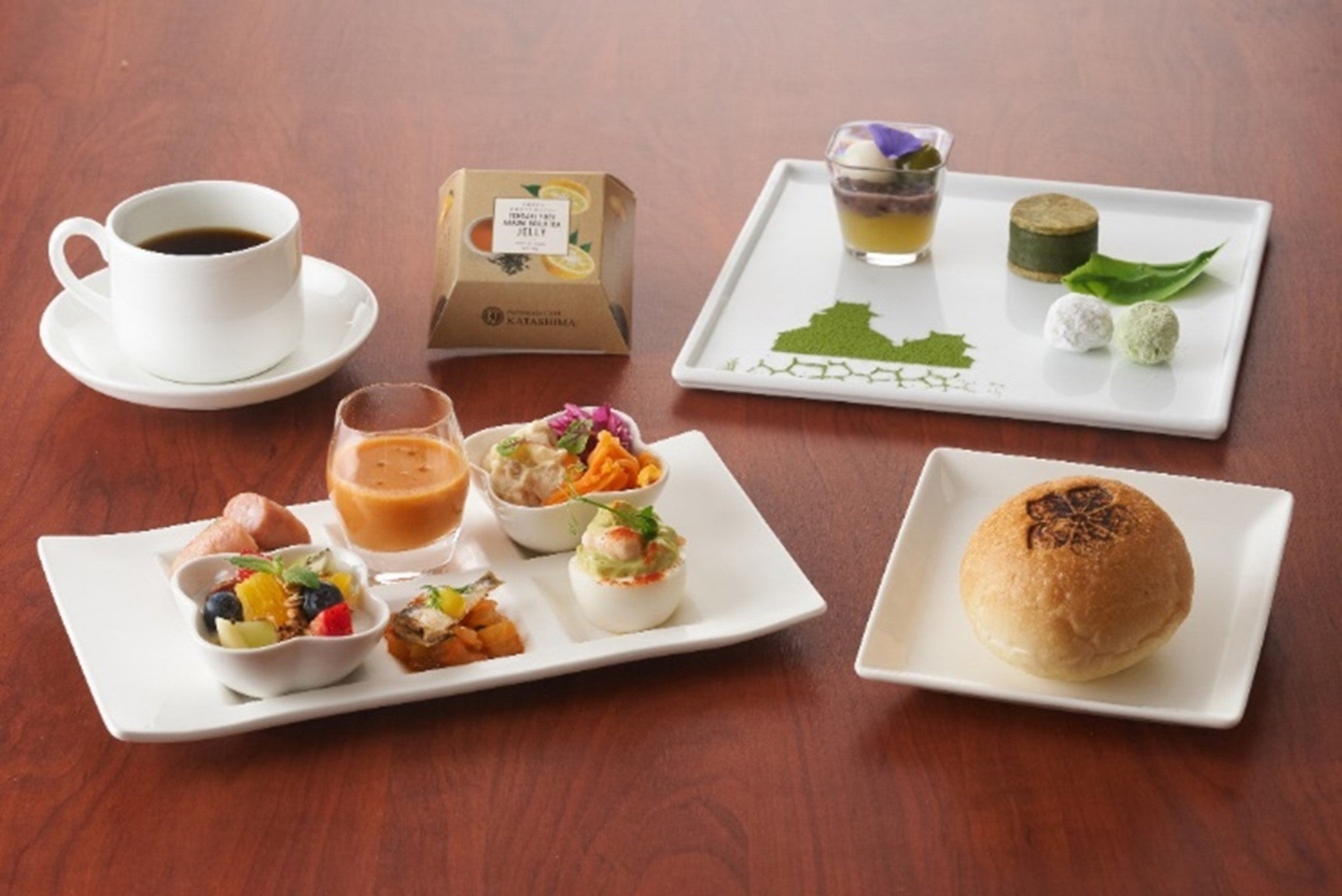 朝食プレートは、福知山城を築いた明智光秀の家紋【水色桔梗】を焼き印で表したフォカッチャとともに召し上がっていただく、地元食材を使用した冷製スープ『ガスパチョ』や天橋立オイルサーディンとラタトゥイユなど目にも鮮やかな6品をご用意しています。デザートプレートは、福知山茶と天滝ゆずのブールドネージュや抹茶のテリーヌサブレサンド、玉露ジュレと白玉あずきの福知山茶をふんだんに使用した3品と、福知山城を抹茶パウダーで描いた「見た目も楽しい」一皿です。
