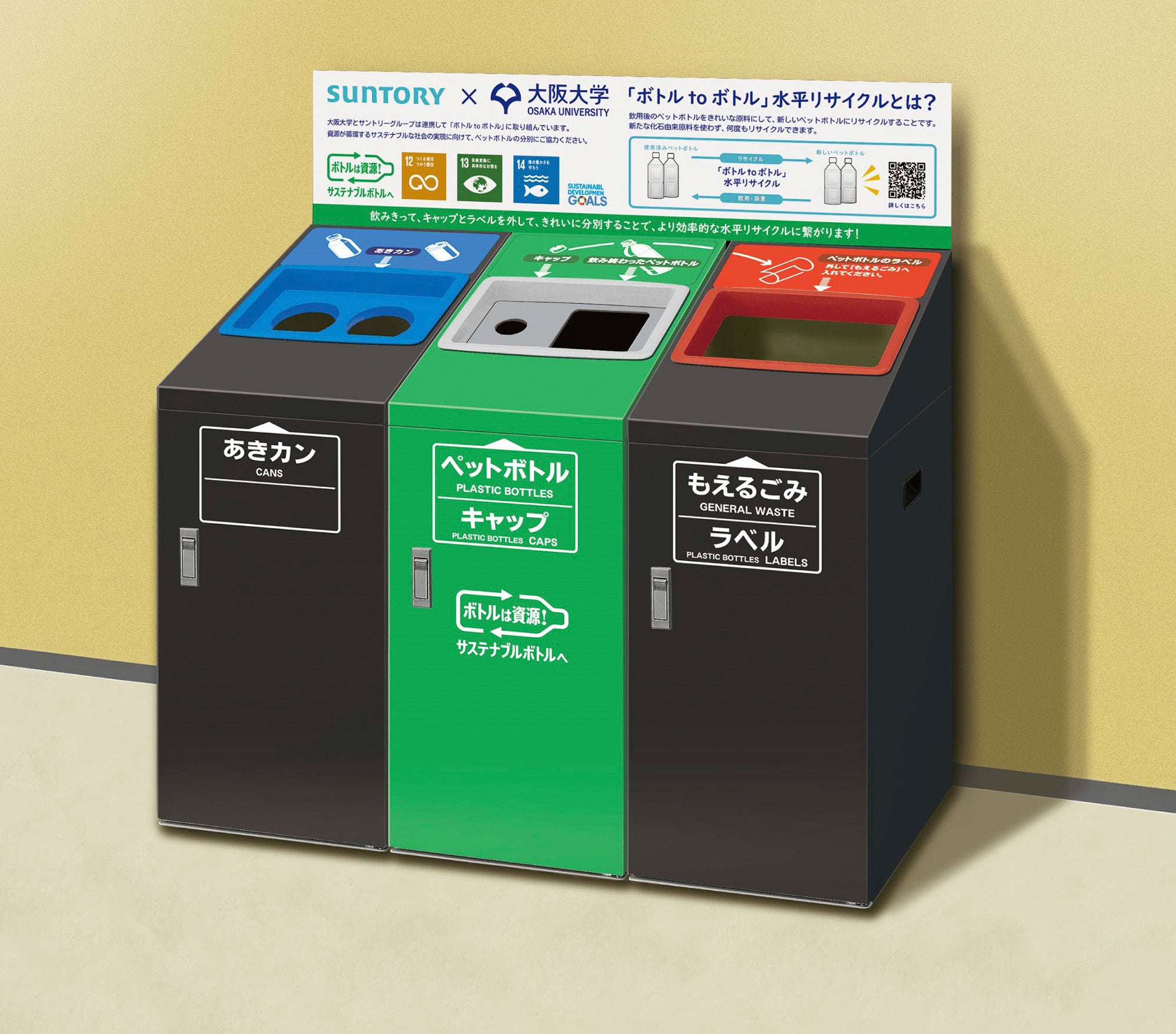今回の取り組みにあたり、大阪大学と協働で制作したオリジナルリサイクルステーションをそれぞれのキャンパスに順次設置し、利用者の方々にパネルなどでペットボトルの分別投入の啓発を実施します。また、今後プラスチックの循環推進等の教育啓発も連携して行っていく予定です。