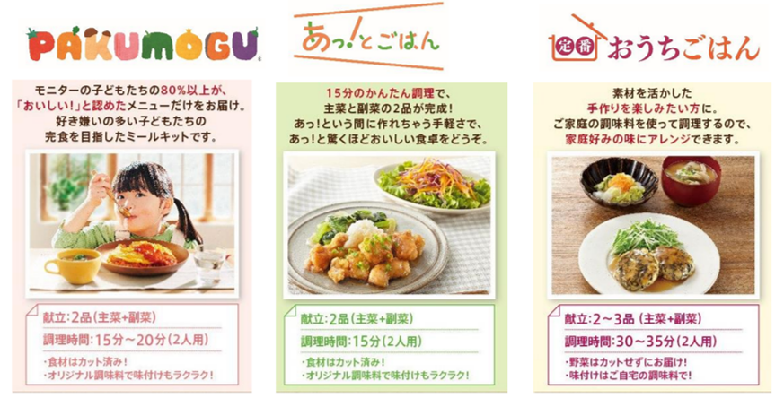 「ワタミの宅食」では、ミールキットとして「PAKU MOGU」「あっ!と ごはん」「定番おうちごはん」の3つのブランドを展開しております。カット済み食材、オリジナル調味料、レシピをセットでご自宅までお届けすることで、献立を考える手間や買い物の手間を省きます。レシピを見ながら、15分~35分のかんたん調理で、2~3品の料理が完成できる、共働き世帯の時短ニーズに対応した商品です。献立は、管理栄養士が設計しており、一週間を通してバランスのとれた食事がとれるよう配慮しています。