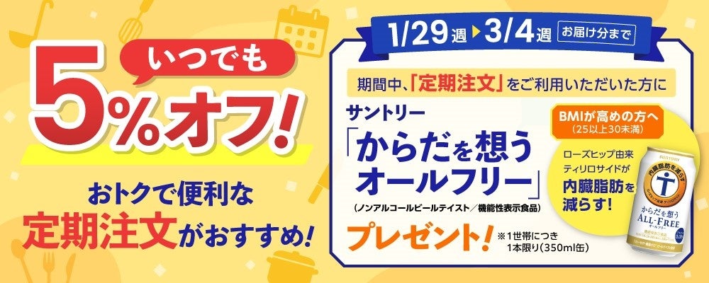 対象期間中に、ワタミのミールキット「PAKU MOGU」「あっ!と ごはん」「定番おうちごはん」の定期注文をご利用いただいたお客さま全員に、サントリー「からだを想うオールフリー」をプレゼントいたします。(プレゼントは1世帯につき1本)定期注文は、いつでも通常価格の5%割引価格でご利用いただけるお得なサービスです。