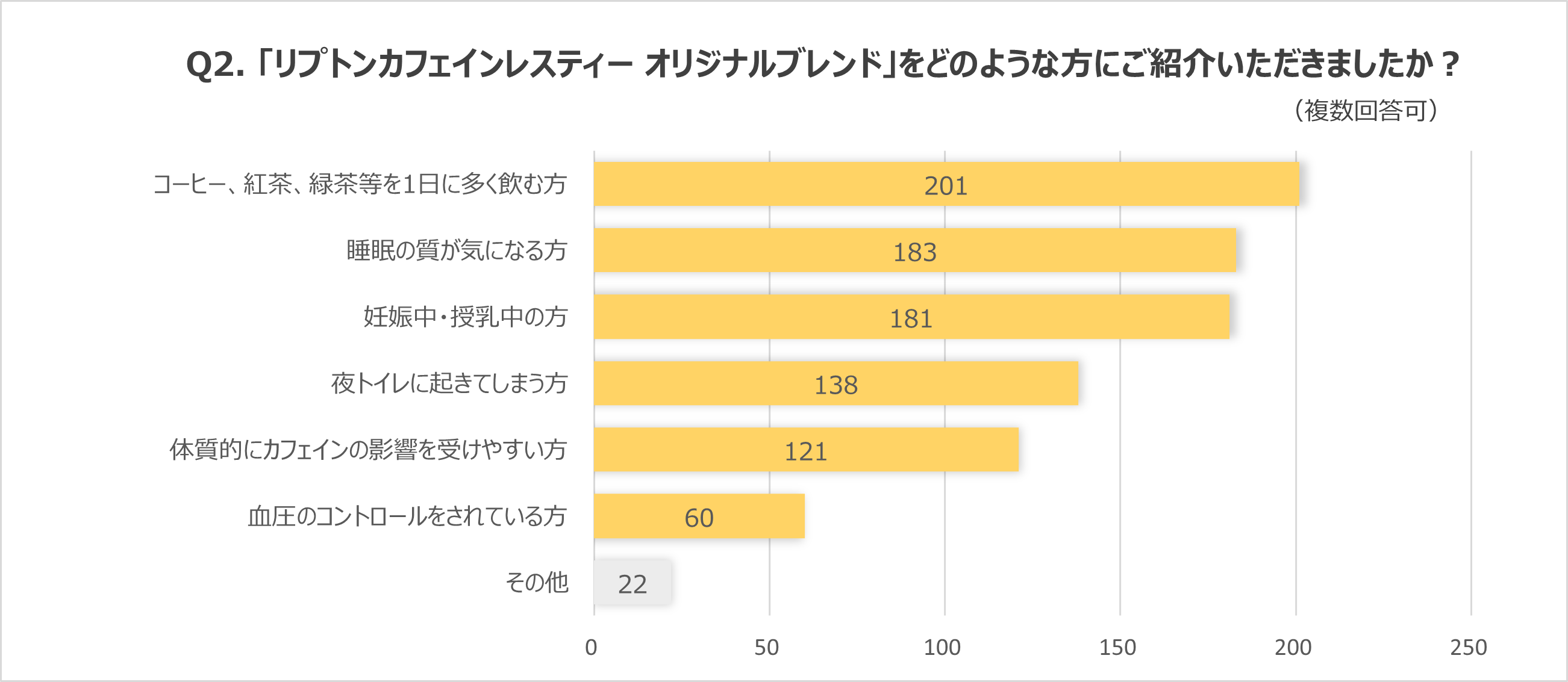 「『リプトン カフェインレスティー オリジナルブレンド』をどのような方にご紹介いただきましたか?」との質問には普段から「コーヒー、紅茶、緑茶等を1日に多く飲む方」へ最もおすすめしたいと、カフェインを必要としている人だけでなく、日ごろから紅茶やお茶の飲用機会のある方へもご紹介いただきました。