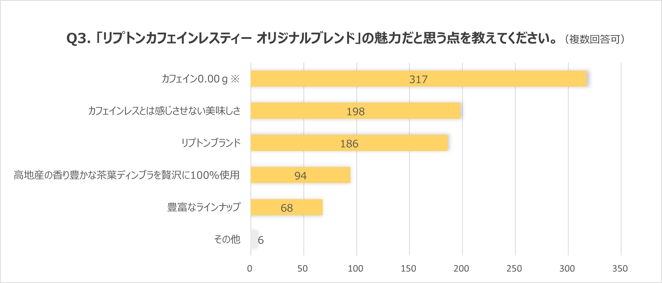 さらに、「『リプトン カフェインレスティー オリジナルブレンド』の魅力だと思う点を教えてください」との質問には、商品特徴でもある「カフェイン0.00g※2」であること、次いで半数以上の管理栄養士の方が「カフェインレスとは感じさせないおいしさ」と回答。2018年の発売以来、「カフェインレスだけど、紅茶本来の味わいと香りを楽しみたい」という幅広い人々に支持されてきた、本製品の魅力を裏付ける結果となりました。