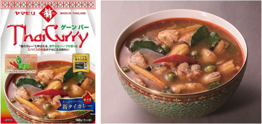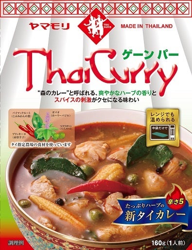 今回発売するヤマモリのタイカレー「ゲーンパー」は、タイ現地で調達するハーブでこのメニューの魅力をしっかりと再現しました。現地自社工場を持つ強み、そして、タイカレーを日本で販売開始して今年で25年目という経験と技術で本格的な味わいに仕上げました。また、ヤマモリ タイカレーの特徴である大きめにカットした具材(鶏肉、ヤングコーン、スズメナス)がたっぷりと入っています。