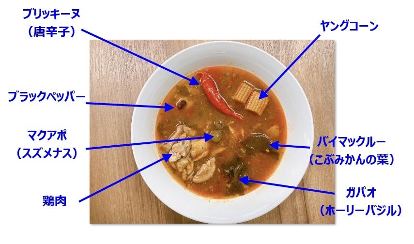 ●「森のカレー」という意味で、山の素材を生かしたタイ中部地方のカレーです。 ●ココナッツミルクを使用しないさらっとした液状で、すっきりとした辛さに仕上げています。 ●具材は鶏肉、スズメナス、ヤングコーン、プリッキーヌ、ホーリーバジル、こぶみかんの葉、タイショウガ(ガチャイ)を使用しています。