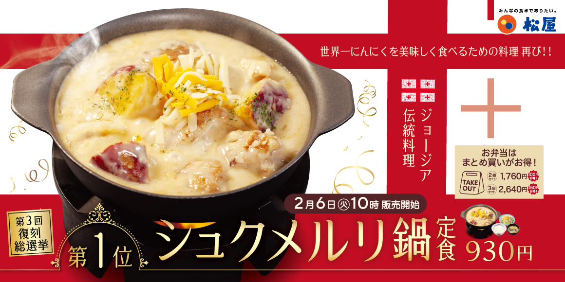 2019年12月にテスト販売で登場、2020年1月に全国販売を開始した松屋の「シュクメルリ鍋定食」は、その後多くの方にご愛顧いただきました。その後「第2回松屋復刻メニュー総選挙」で1位を獲得し、その冬2021年1月に期間限定で復活登場。この度、2023年7月に実施した「第3回松屋復刻メニュー総選挙」にて再度1位を獲得し、この度の復活販売が決定いたしました。